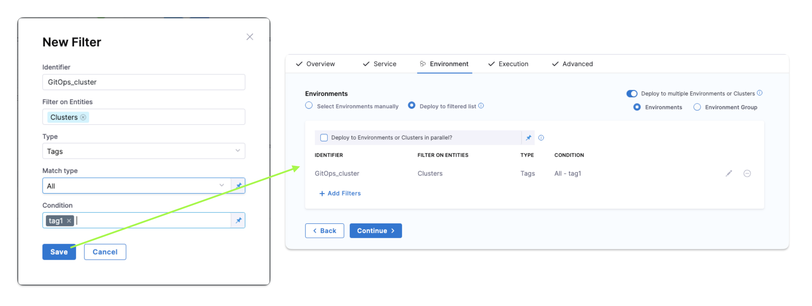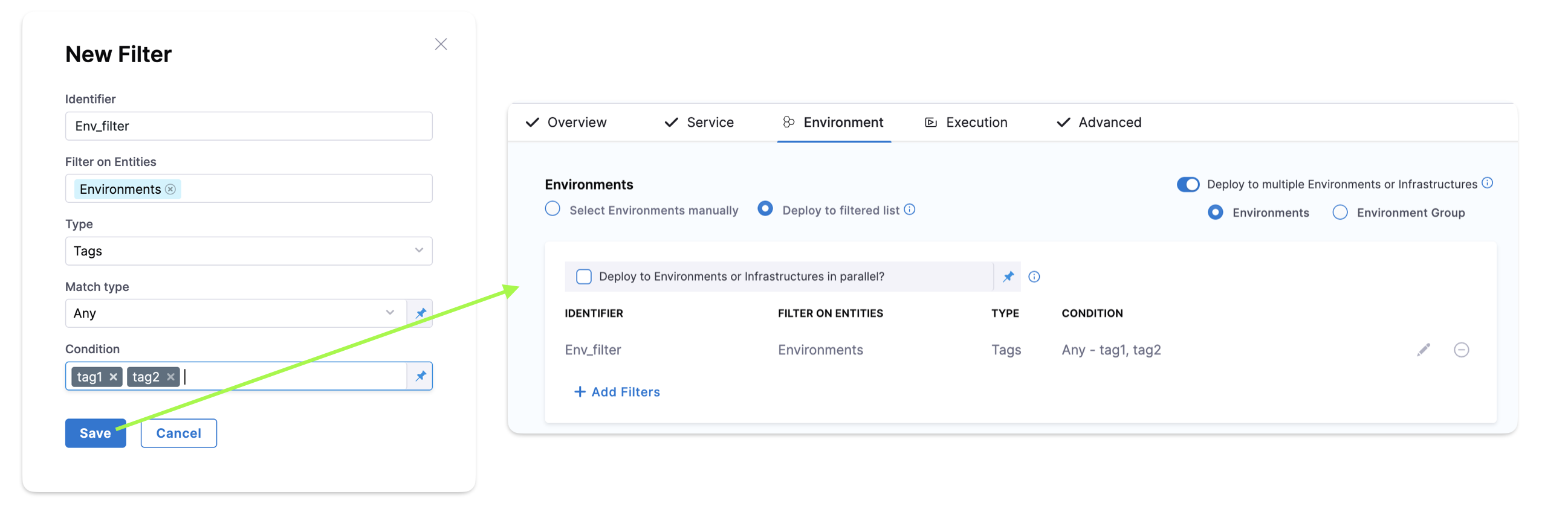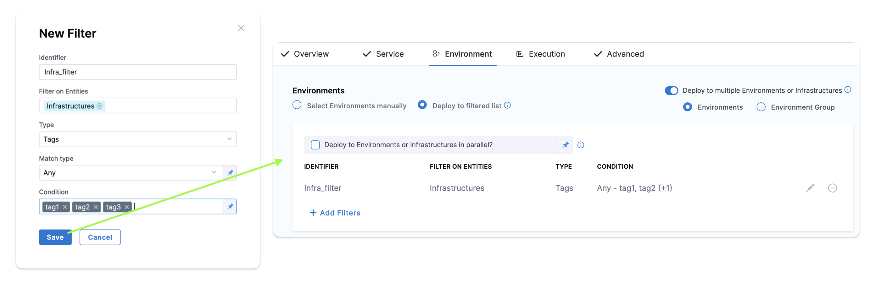 You can select one or more environments (or an environment group), and then one or more infrastructures in each environment. - In Environments, select Deploy to filtered list, and then select + Add Filters.