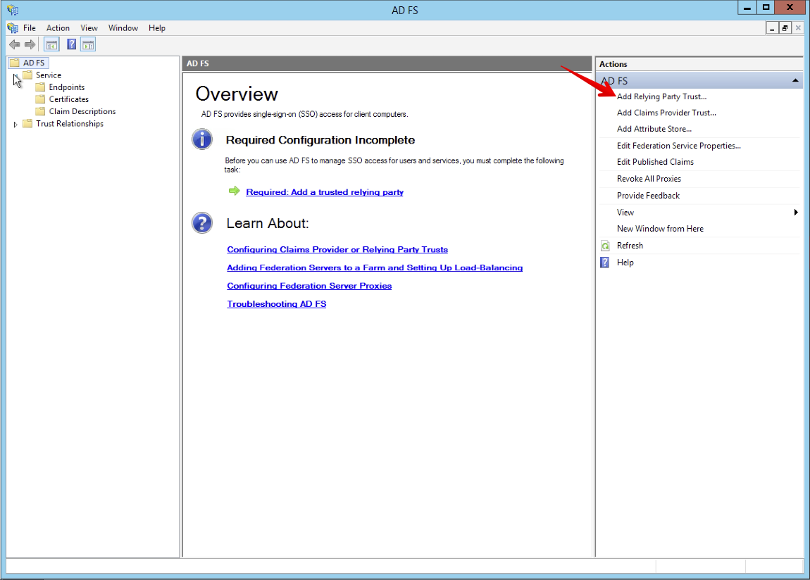 1. Open the AD FS management console by going to the Server Manager console and selecting AD FS Management from the Tools list (on the right).